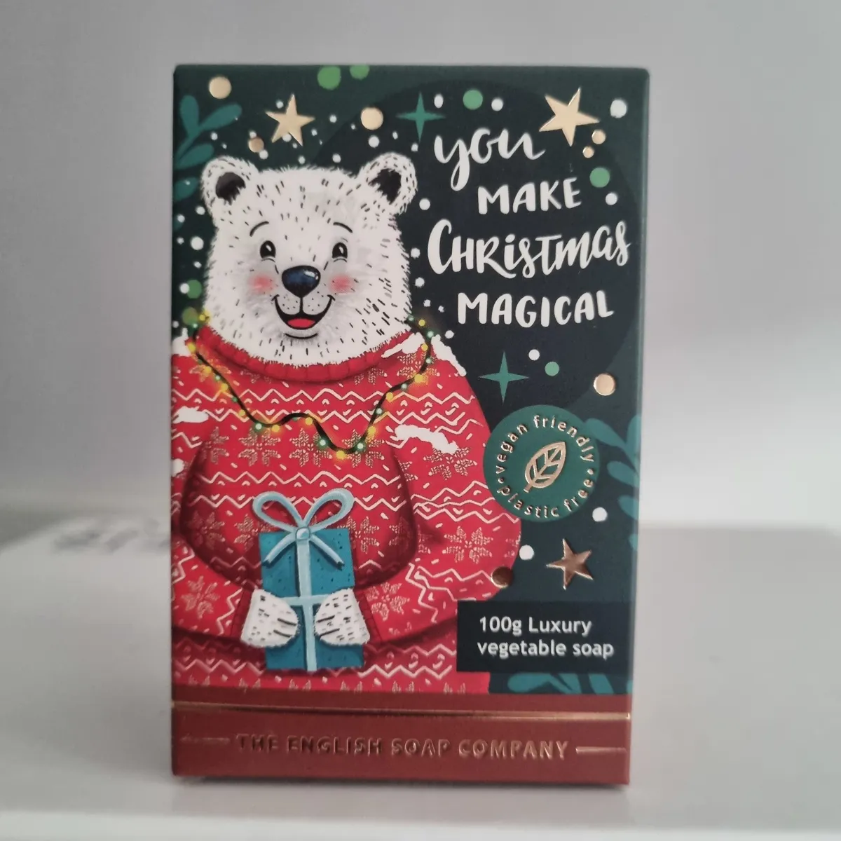 Experience luxury self-care with this beautifully fragranced Luxury Shea Butter Gift Soap in a variety of Christmas packaging from the English Soap Company. Generously fragranced and expertly crafted from pure vegetable oils and enriched with shea butter, this vegan-friendly soap produces a rich, silky lather that scents and nourishes your skin. Presented in fully recyclable packaging with no plastic waste and adorned with a charming design., these eco-friendly soaps are the perfect gift or indulgent treat for yourself.