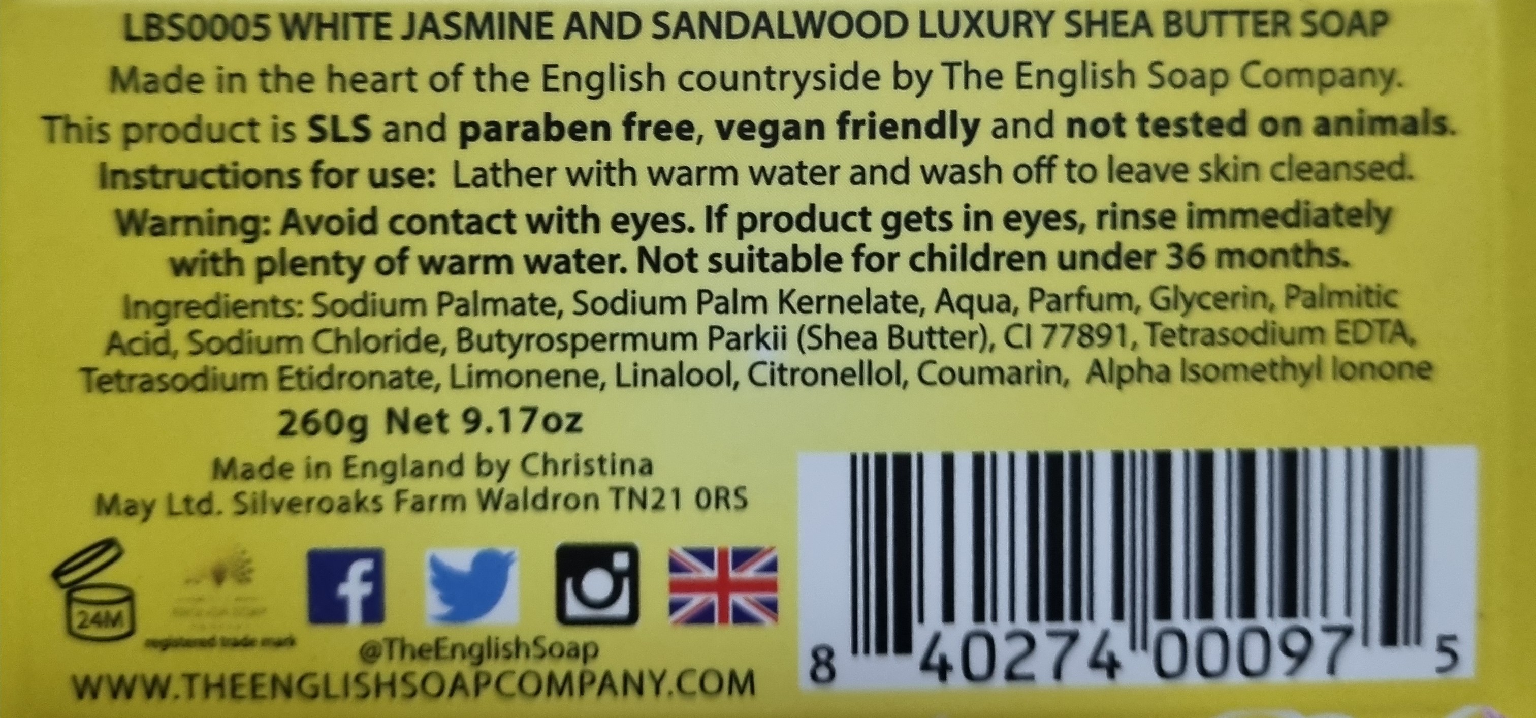 Experience luxury self-care with this White Jasmine & Sandalwood Shea Butter Gift Soap from the English Soap Company. Generously fragranced and expertly crafted from pure vegetable oils and enriched with shea butter, this vegan-friendly soap produces a rich, silky lather that scents and nourishes your skin. Presented in fully recyclable packaging with no plastic waste and adorned with a charming design., these eco-friendly soaps are the perfect gift or indulgent treat for yourself.