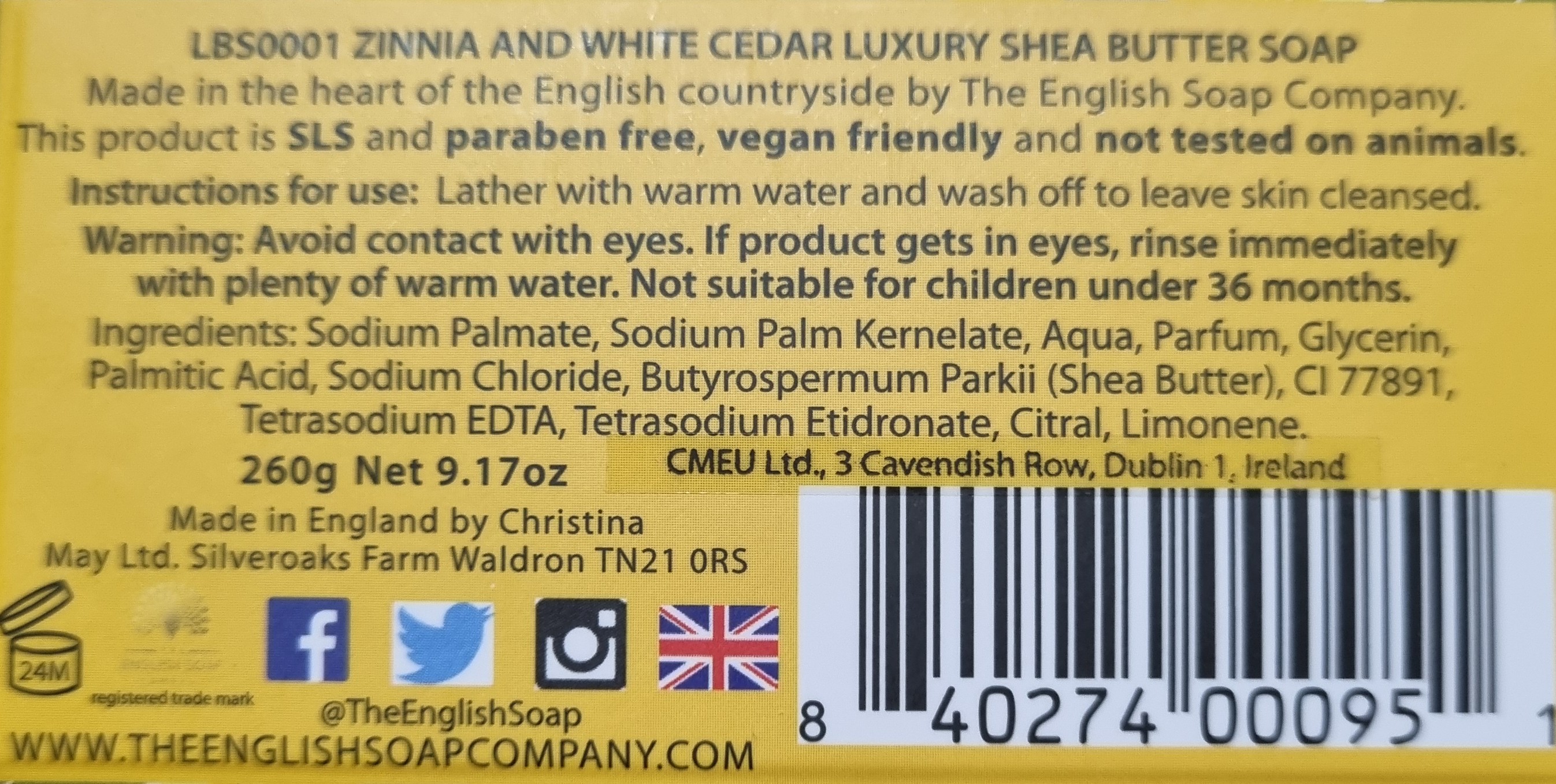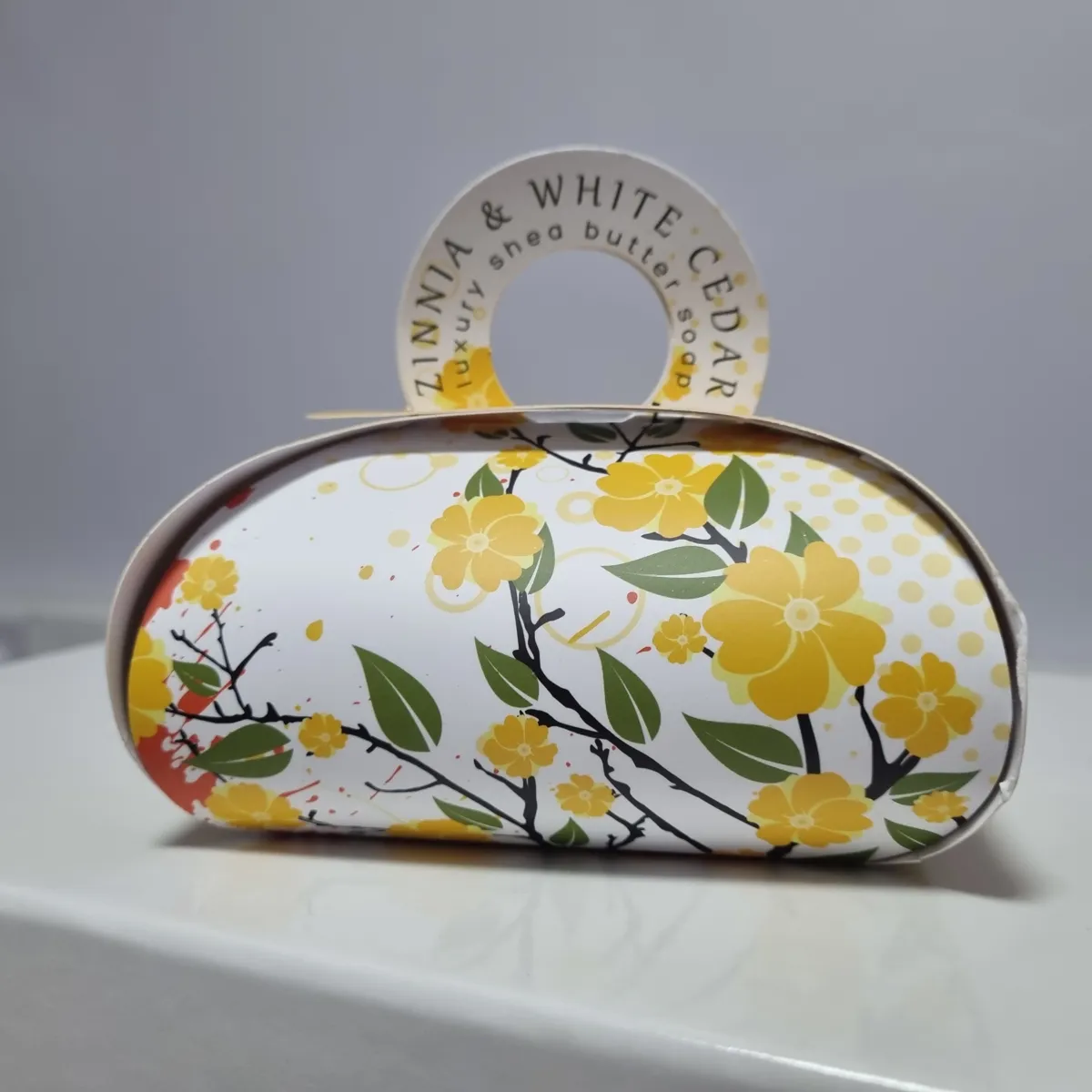 Experience luxury self-care with this Zinnia & White Cedar Gift Soap from the English Soap Company. Generously fragranced and expertly crafted from pure vegetable oils and enriched with shea butter, this vegan-friendly soap produces a rich, silky lather that scents and nourishes your skin. Presented in fully recyclable packaging with no plastic waste and adorned with a charming design., these eco-friendly soaps are the perfect gift or indulgent treat for yourself.
